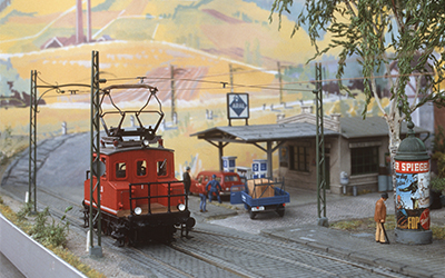 Der erste Bausatz, den Hans selbst zusammenbaute, war eine kleine Elektrolokomotive. Sie erhielt die Bezeichnung OLB 1, was für "Obertrauner Landeseisenbahn" stehen sollte. Ihr folgte der erste Straßenbahnwagen. Vor dem Bahnhof entstand eine kleine Straßenbahnszene, die es aber so im Original nie gegeben hat.